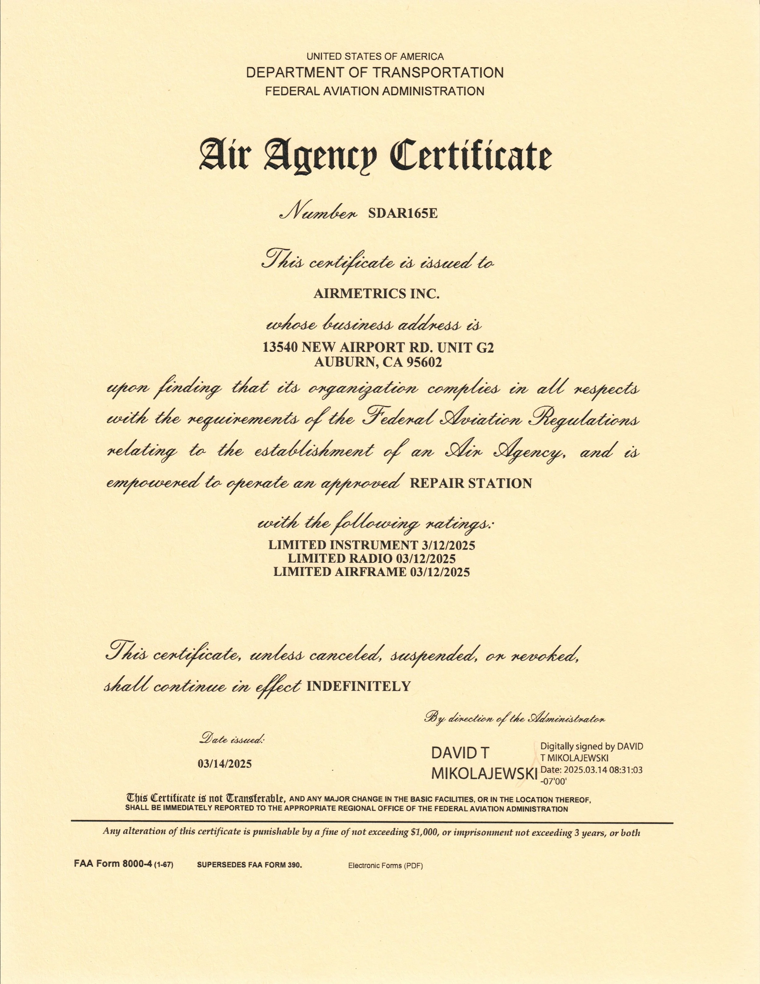 AirMetrics maintains a Part 145 Repair Station Certificate with the following ratings: Limited Instrument, Limited Radio, and Limited Airframe.